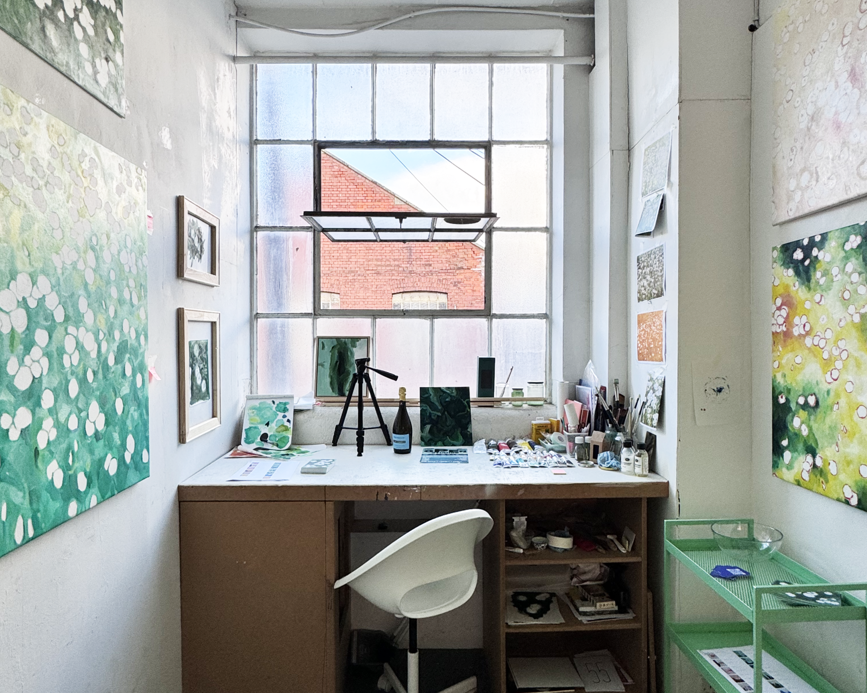 It's this amalgamation of architecture and art that informs my early art practice as a painter. Each painting starts with an observation of the everyday. Sometimes it takes a second for the brain to register certain colours, certain compositions, certain spaces. Very often a photo is taken, a clear vision is created in my head. Then comes the painting and you never end up with what the initial intent was. I'm heavily focused on the interpretation of everyday spaces. Sometimes very obvious spaces, sometimes those more hidden and unexpected. Still, quiet, empty, mundane spaces, yet still worth exploration and attention. The focus on spaces helps to frame the subject, and work as a starting point for the painting process. But on a more artistic level it is a study of interpreting, noticing, remembering and reimagining. The practice focuses on observation and the appreciation of the everyday. There is so much detail, nuance, and the unexpected in natural and man made reality. Yet in the end it is the colour that overtakes the process of reimagining and reinterpreting. It liberates the rigid form of reality and translates it into a bold new creation. The brushstrokes are blurry, haphazard, intentional, sometimes purely accidental. It's the colour that conveys the emotion of the finished piece.